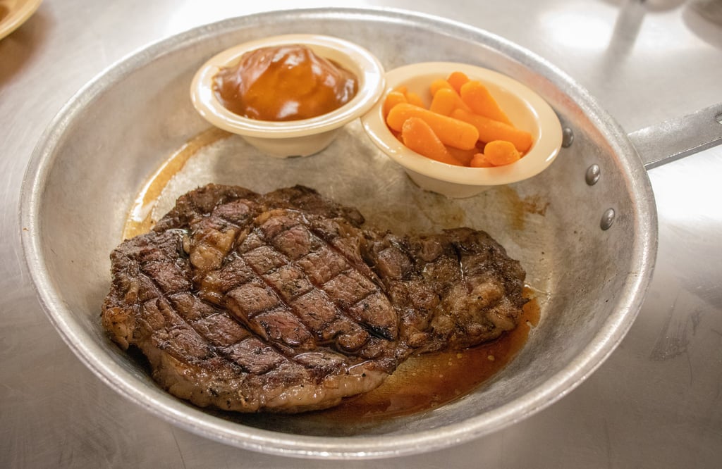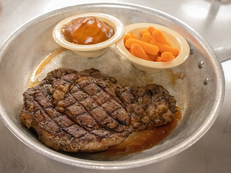 A thick cut hand trimmed ribeye, charbroiled to the perfect temperature. Served with 2 sides and the pass arounds