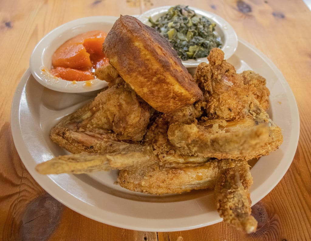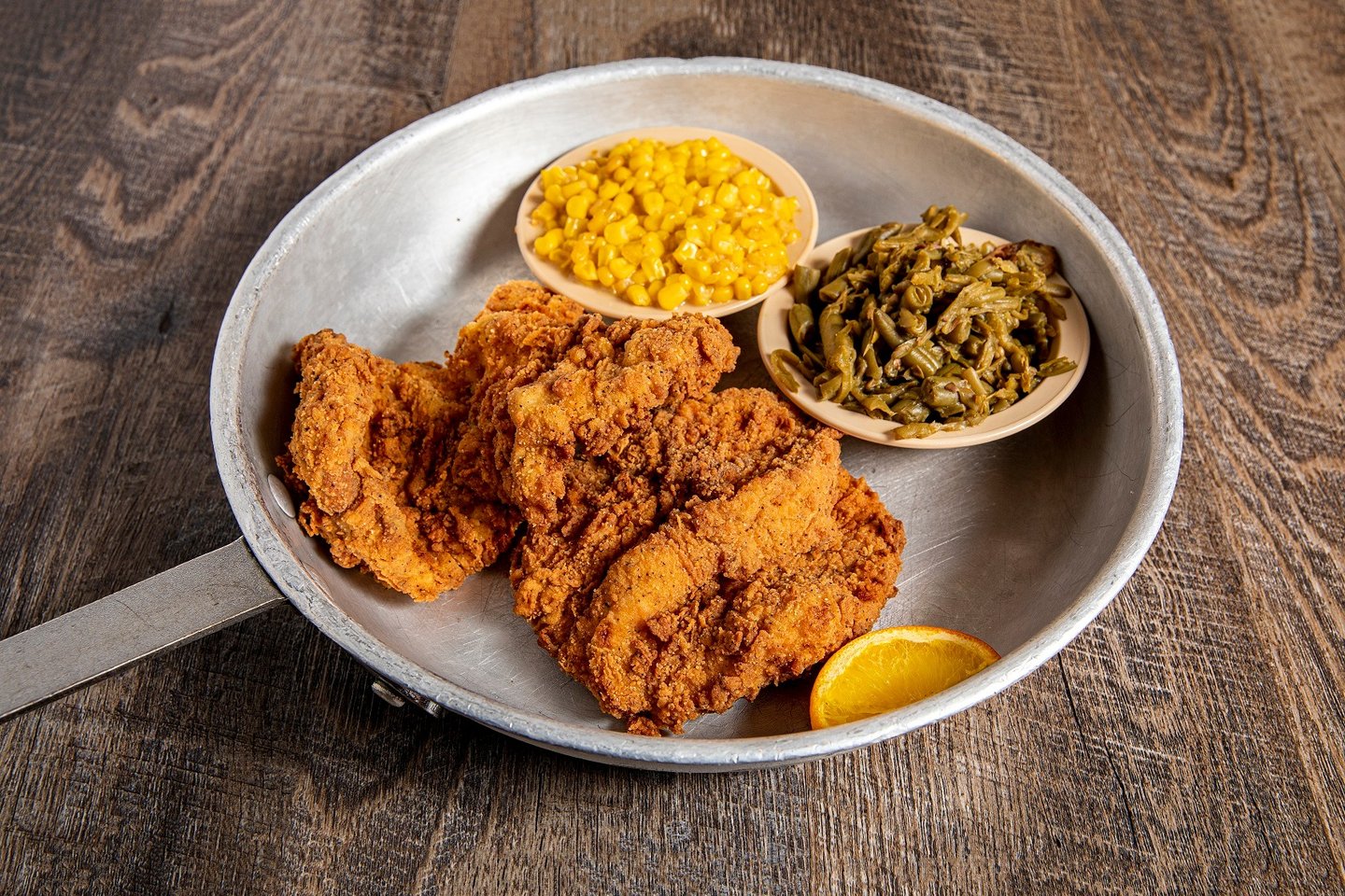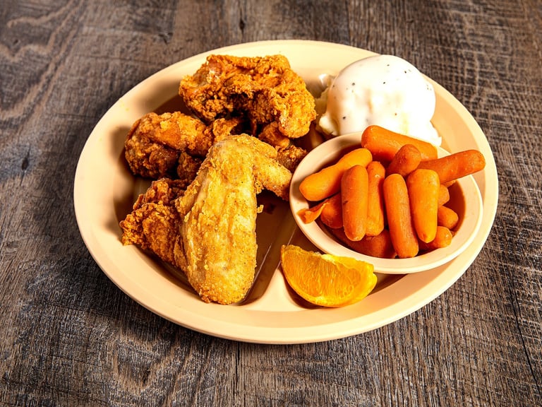 A generous amount of fried chicken, piled up and served with 2 sides and all the pass arounds.*W D