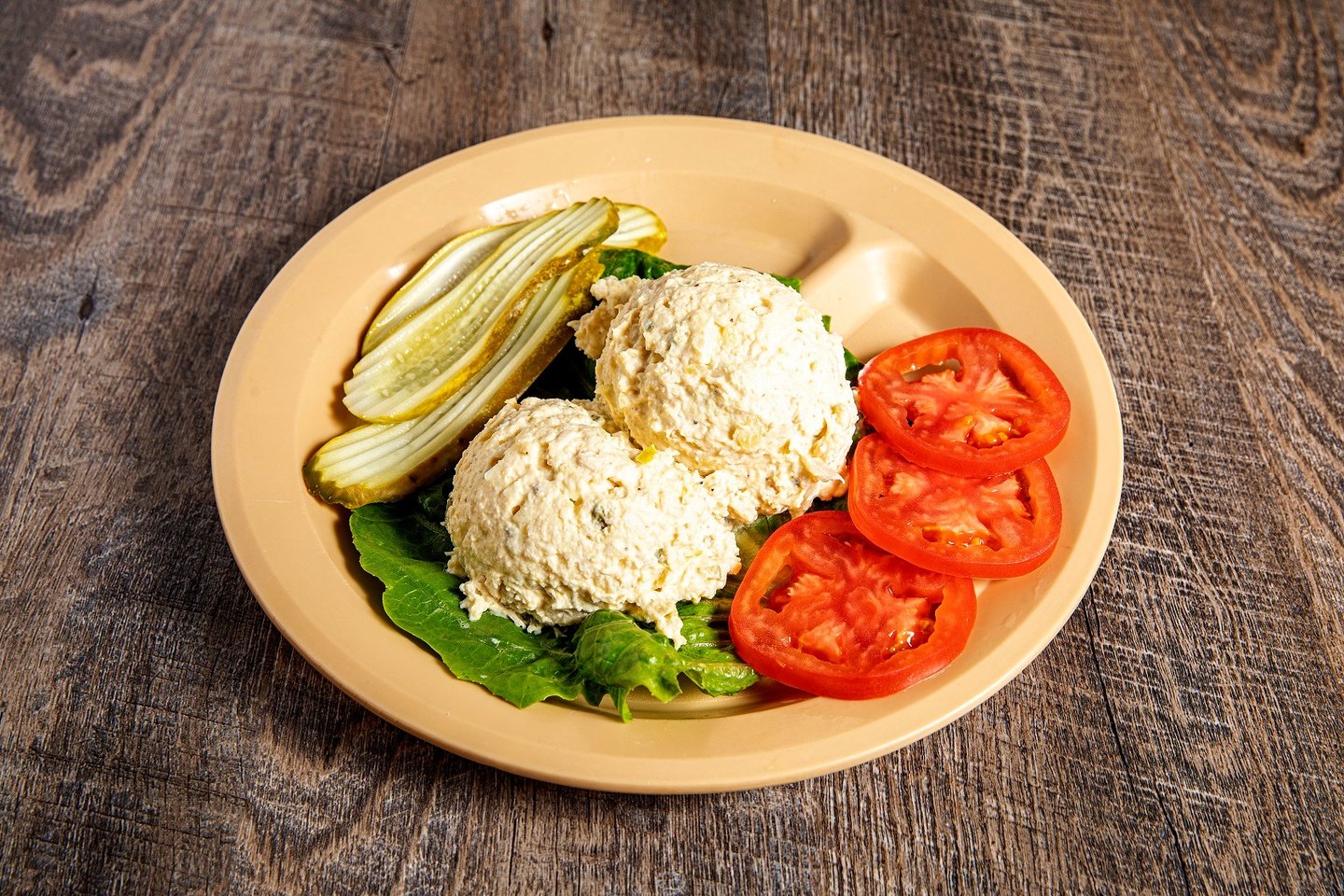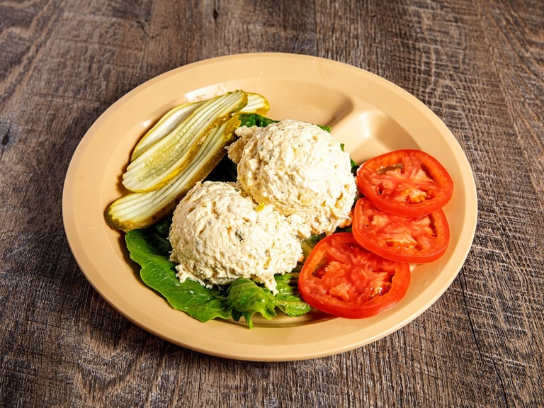 Mrs. Agnes started with chunks of white meat for her chicken salad, added mayo, pickles, onion and egg, then scooped it onto a bed of lettuce and served it with crackers. We still do it the same way, plus you get 2 sides and the pass arounds.*E S G W