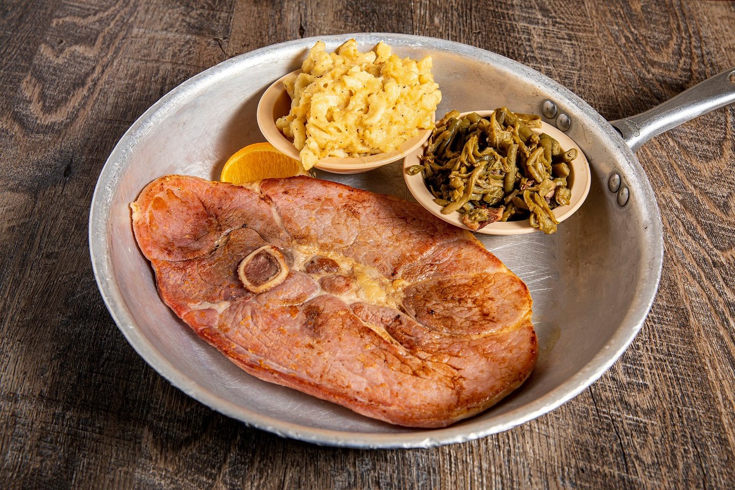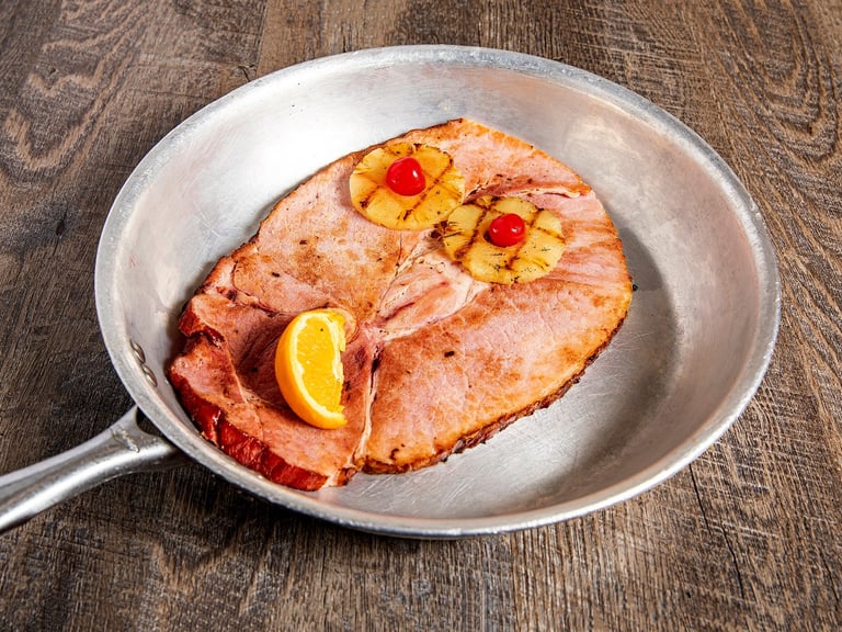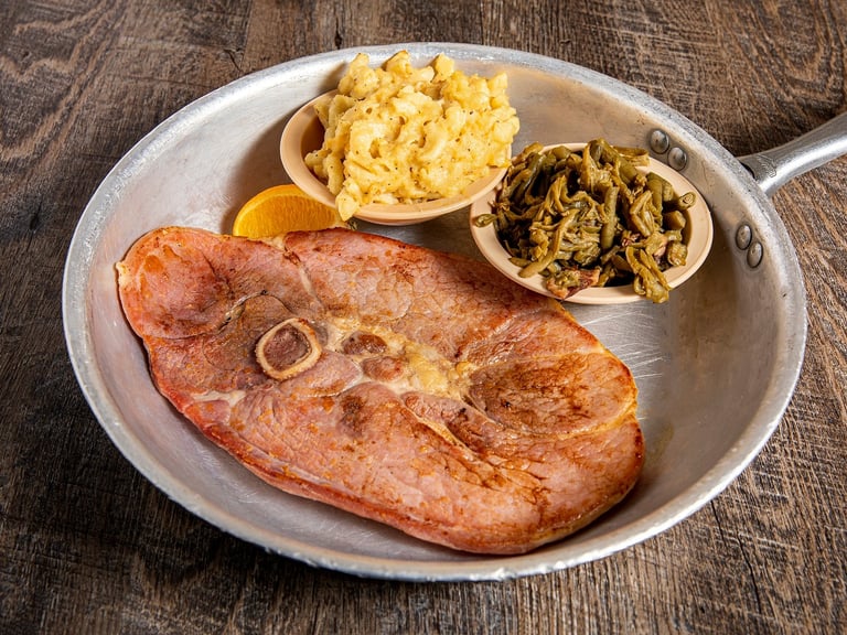 JUST EXCELLENT! The old fashioned bone-in-center slice of ham. Served in a skillet with 2 sides and ol' Norm's pass arounds.*D SB