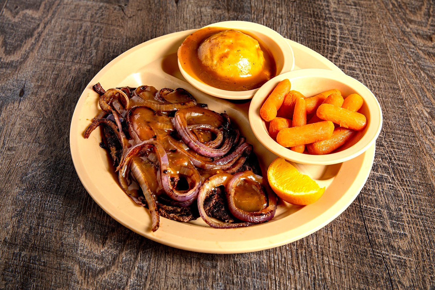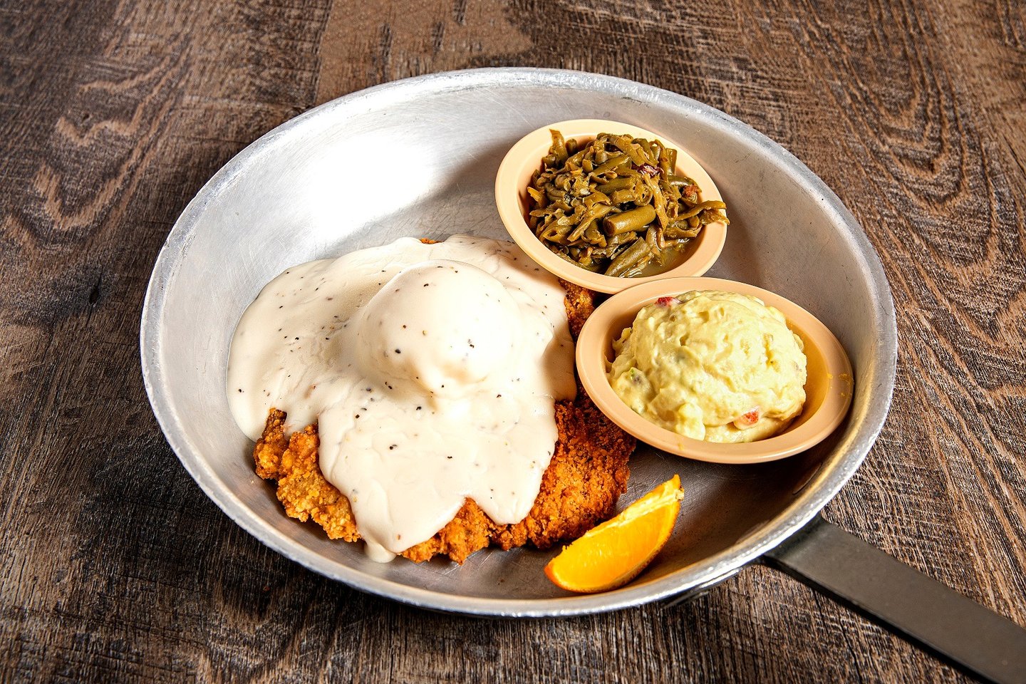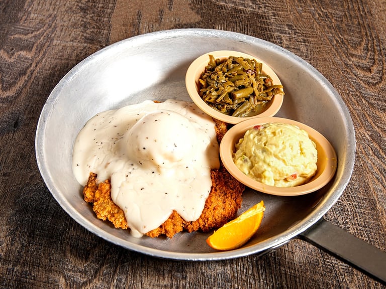 Really - the old fashioned beef round steak. Breaded and deep-fried, served with mashed potatoes and covered in milk gravy. Add your choice of 2 sides and ol' Norm's pass arounds!! *W S G, Gravy*D W G Y