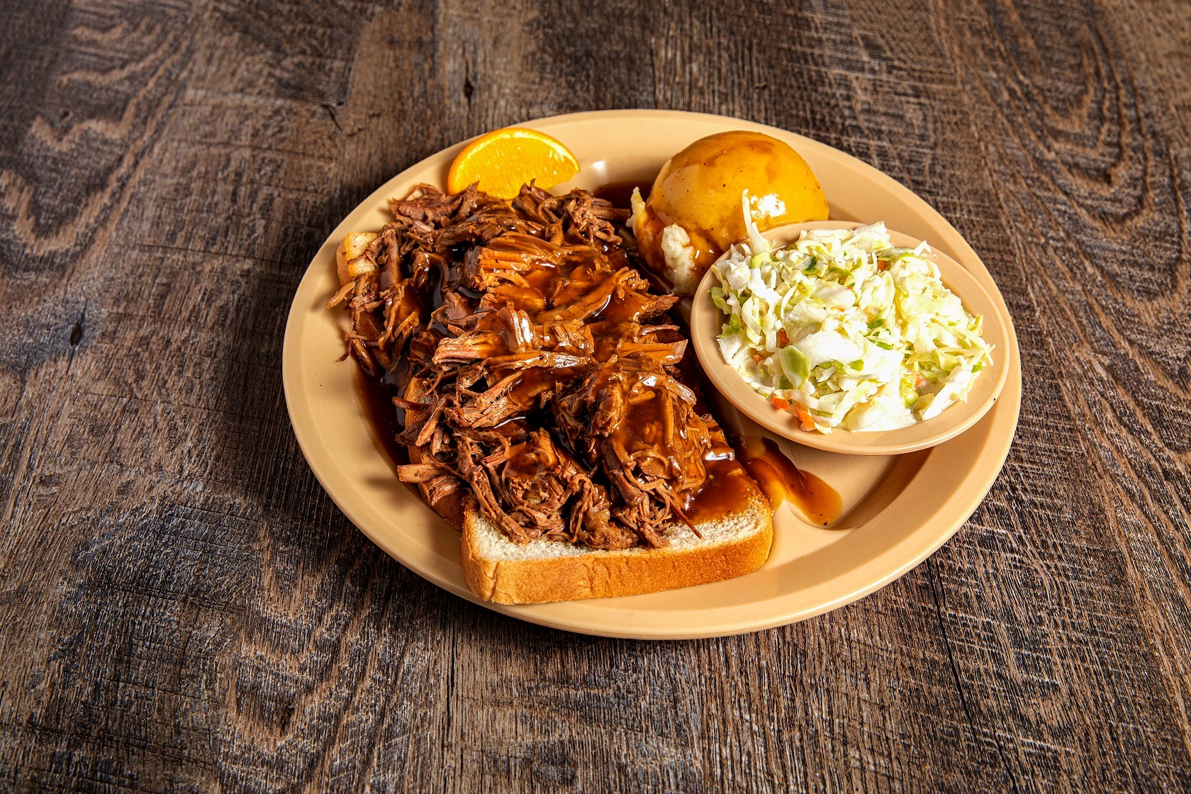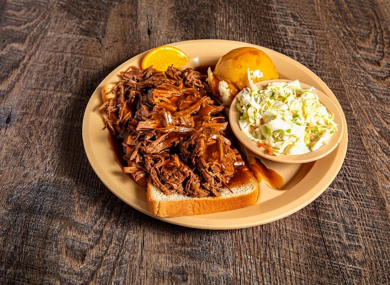 An open faced pot roast sandwich with gravy. Served with mashed potatoes, cole slaw and all the pass arounds.*S W, Gravy*D S W G