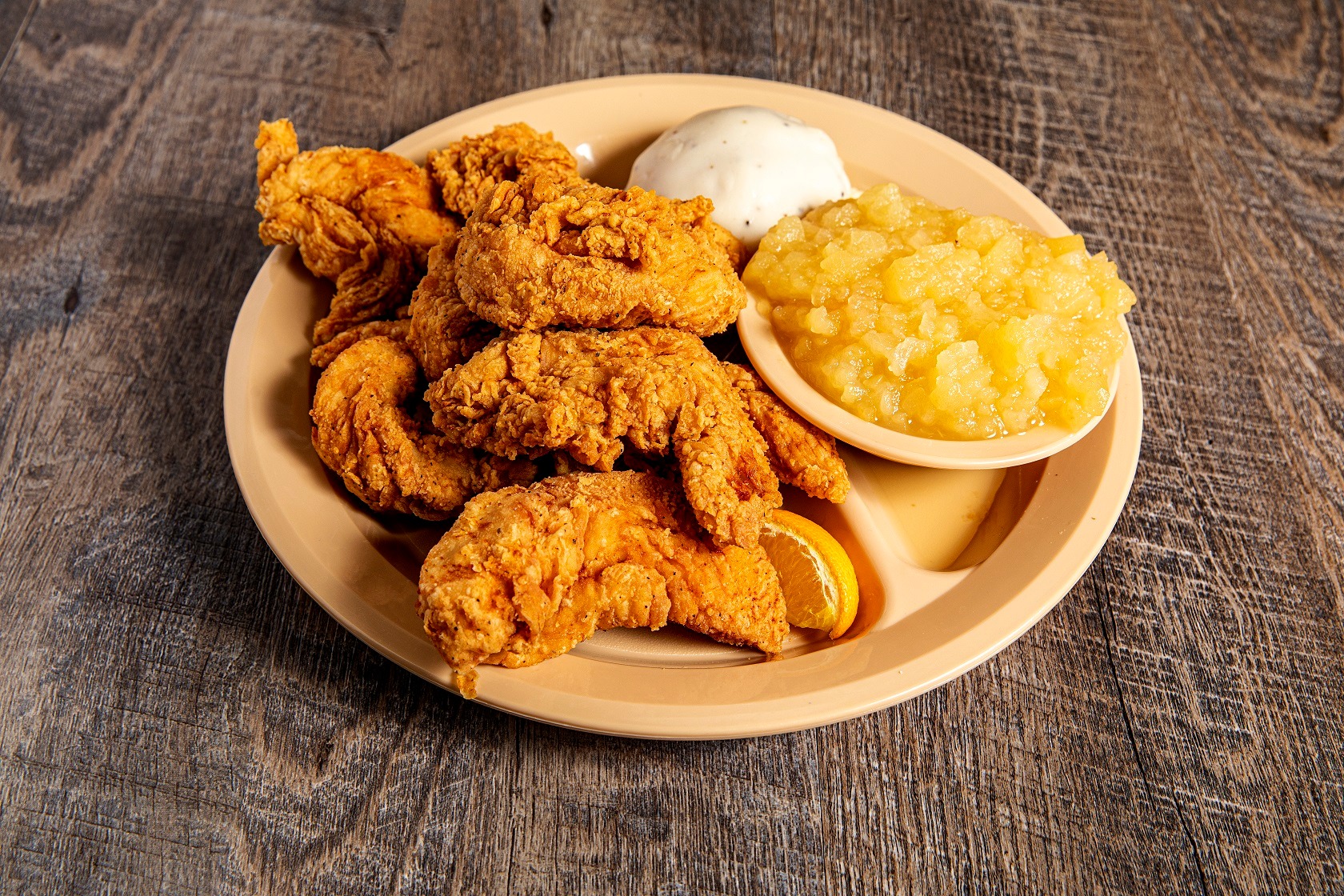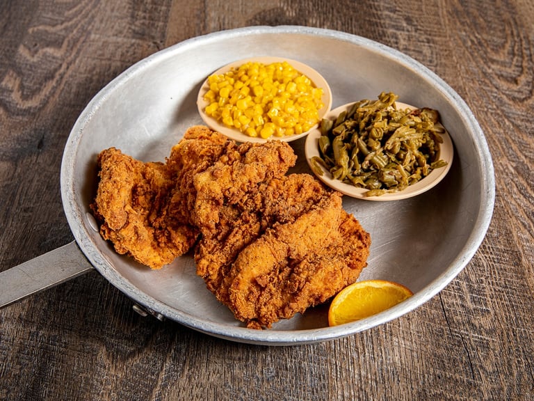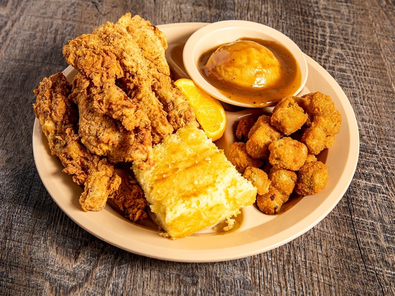 Hand breaded, all white meat tenderloins. Deep-fried and served with gravy, honey mustard, or BBQ sauce. However you like. 2 veggies and the pass arounds make this one of our customers favorites, over and over again.*W D