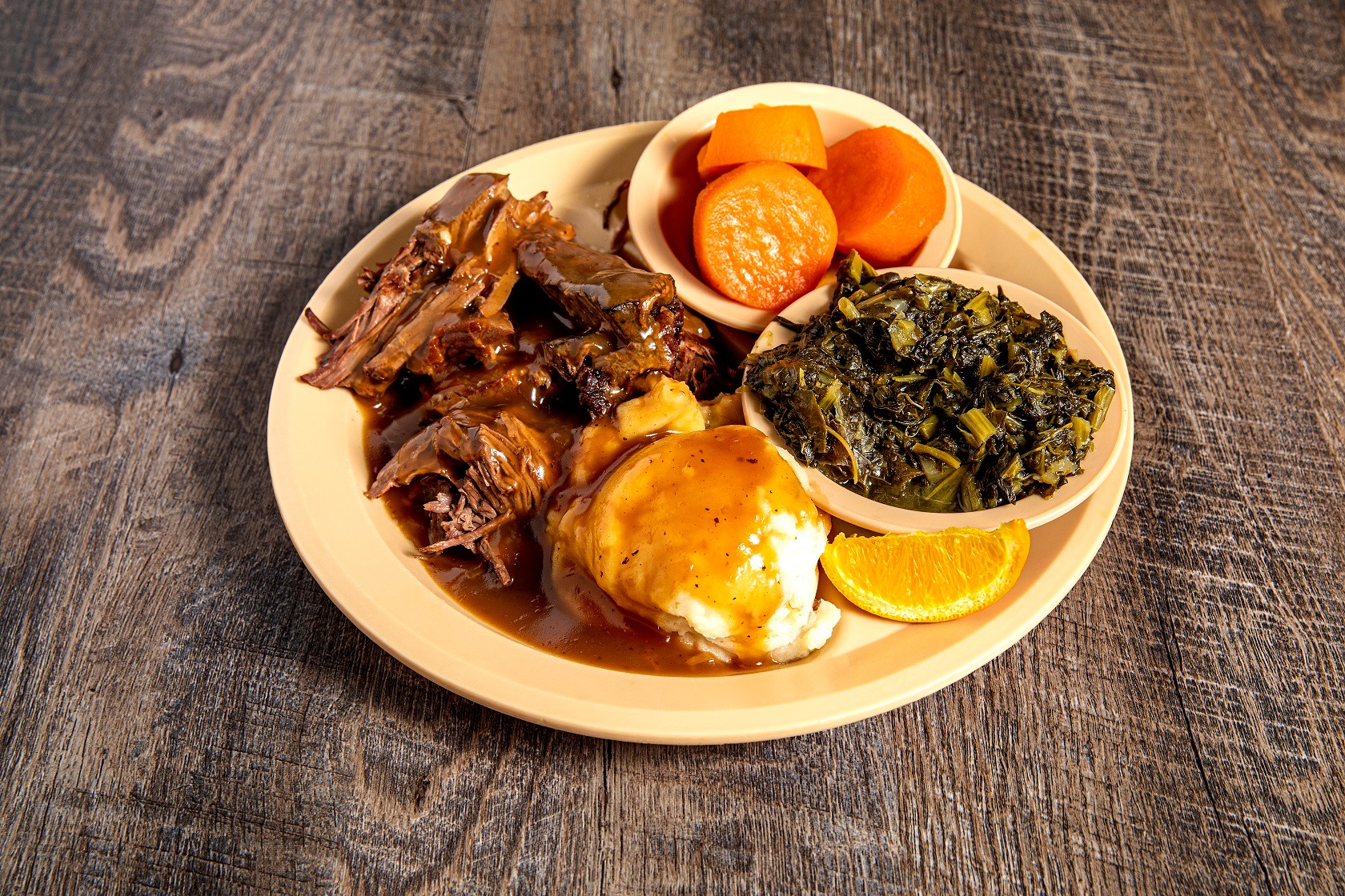 Old fashioned pot roast and gravy piled up with mashed potatoes, 2 sides and Norm's pass arounds! *D S W G