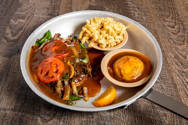 100% ground beef topped with sautéed peppers, mushrooms, onions & tomatoes, smothered in gravy and served with 2 sides. Plus all the great pass arounds.*G W, Gravy*D S W, Veggies*S B D