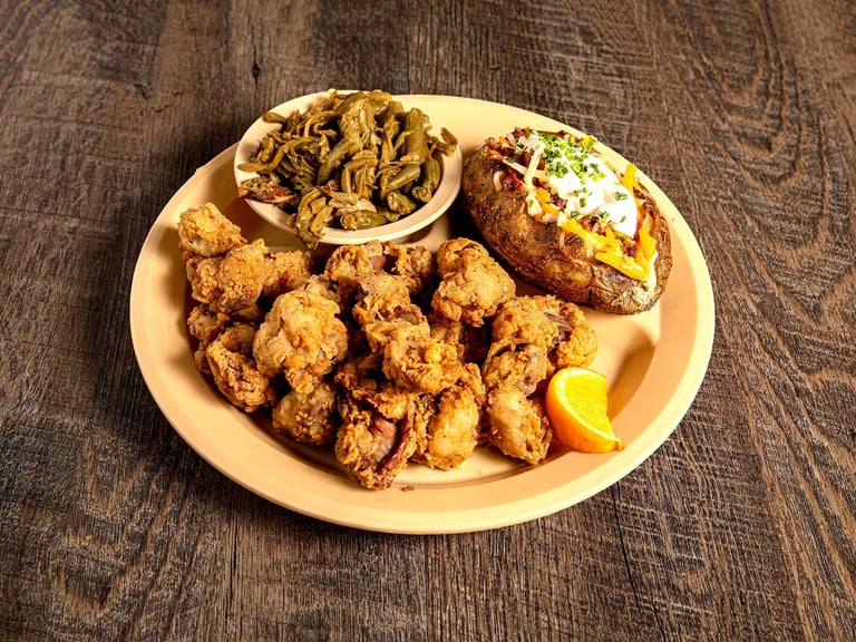 Separately or try them half-n-half if you just want 'em both. They're breaded and deep-fried. Comes with mushroom gravy and any 2 sides of your choice, plus all the pass arounds. *W D G