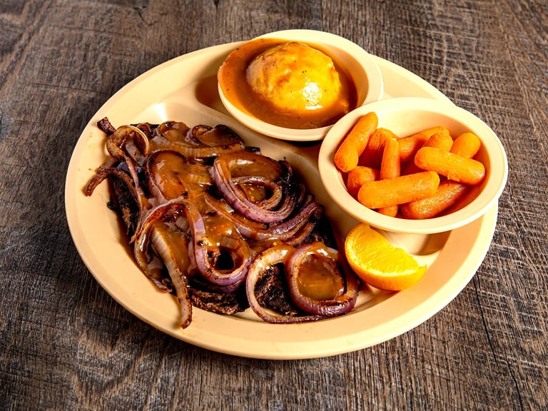 Fresh 100% beef liver smothered in onions and gravy. Plus 2 sides of your choice and the pass arounds.*S D
