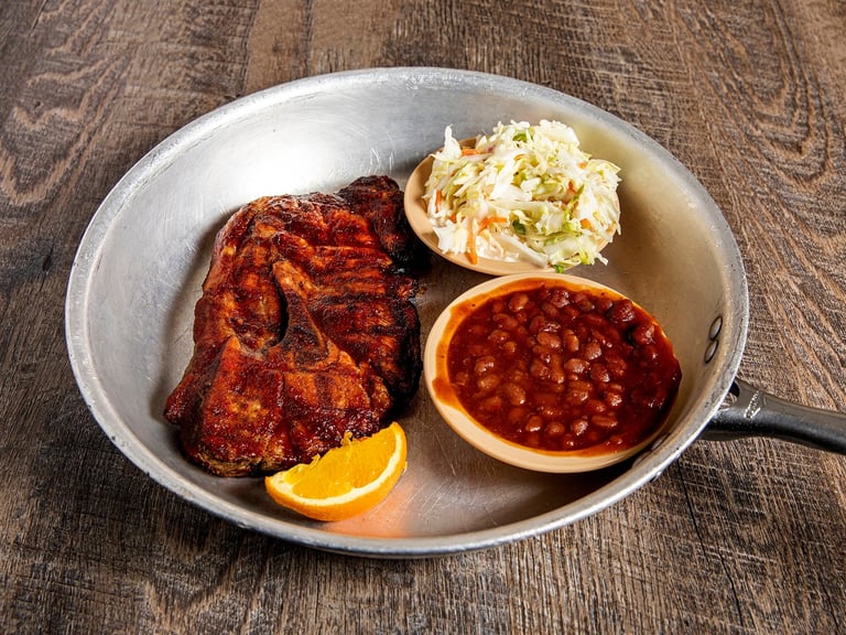 A fresh cut pork steak (from a real nice ol' hog). You get your choice of 3 sides and all of Lambert's pass arounds. You'll see why this is one of our top sellers.