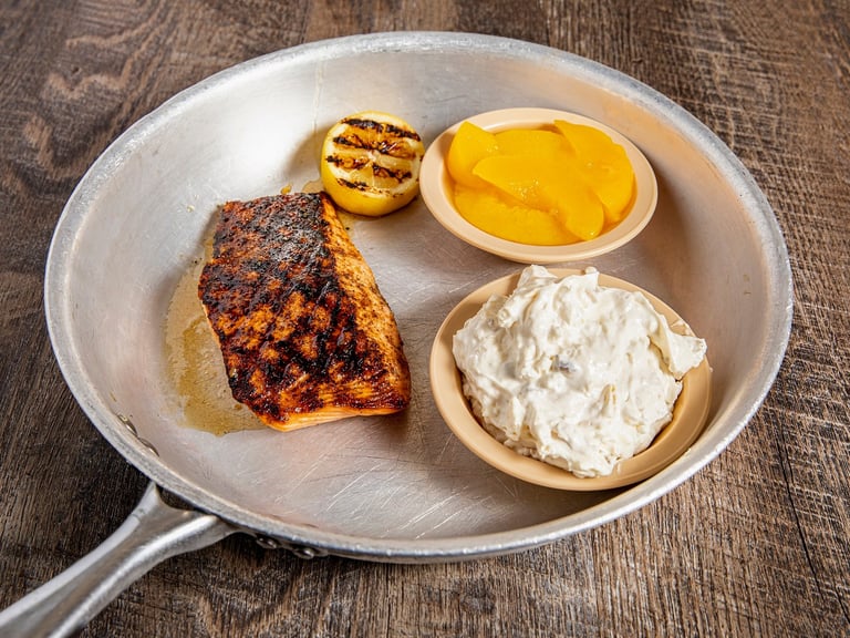 An generous portion of salmon grilled to perfection with 2 sides of your choice and all the pass arounds.
